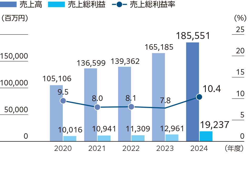 前中期経営計画(2022~2024年度)の基本方針における「企業価値の向上」と「人的資源の活用」について、建築事業として取り組み、以下の成果が得られました。「企業価値の向上」については、技術優位性の向上を目指してICT の活用による業務効率化に取り組み、生産性の向上を図るとともに、環境に配慮した設計や技術提案力の高度化を推進しました。その結果、2022~2024年度にかけて売上高、売上総利益ともに順調に増加しました。前中期経営計画(2022~2024年度)の最終年度に当たる2024年度の建築事業の業績は、売上高が1,855億円、売上総利益が192億円となり、2023年度よりそれぞれ12%、48%増加しました。「人的資源の活用」については、ワーク・ライフ・バランスの実現に向けて、就労環境や処遇の改善を図りました。また、新設した業務支援部署を中心とする現場業務の分担による業務効率化の取り組みのほか、人材育成のために若手職員の教育システムを改善するとともに、安全を最優先する企業風土の醸成を図るために安全意識の強化に向けた施策を実施しました。