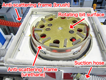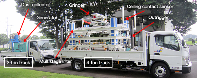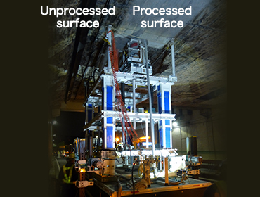 Photo-3 Implementation statusAs a preceding process to the repair and strengthening construction of a tunnel ceiling in service, this machine provides surface preparation, grinding grime or previous coating films off the concrete surface. The high-speed rotating bit of the grinder in the machine is pressed against the ceiling with controlled pressure and provides automatic surface preparation at a constant rate. The grinder is equipped with a double anti-scattering frame and suction device to prevent dust from scattering. This machine saves labor, and improves safety, quality, and uniformity compared to human labor.