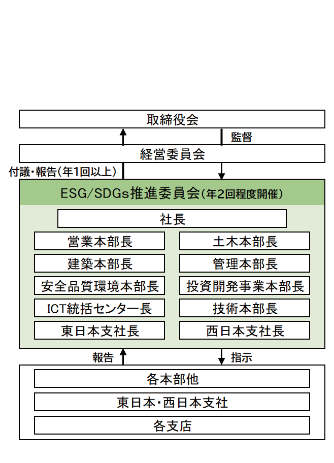 当社グループはESG/SDGs推進委員会を設置し、右図の役員を含めた体制によりESG/SDGsに関わる取り組みを推進しています。