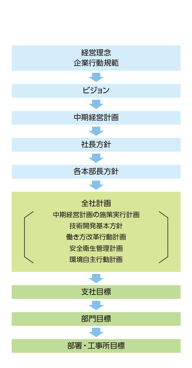 経営理念、企業行動規範のもと、ビジョンを実現するために中期経営計画を最重要課題と位置づけ、社長方針および各本部長方針を策定し、要素別の全社計画に展開しています。また、支社、部門、部署の目標あるいはその他の計画に反映し、品質、環境、安全衛生等の要素ごとのバランスを取りながらPDCAサイクルを回すことで効果的・効率的な改善を図り、目標達成のために取り組んでいます。
