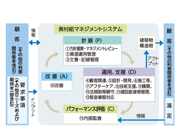 国際規格ISO9001、ISO14001および建設業労働災害防止協会「建設業労働安全衛生MSガイドライン(COHSMS)」に基づいて統合MSを構築しています。