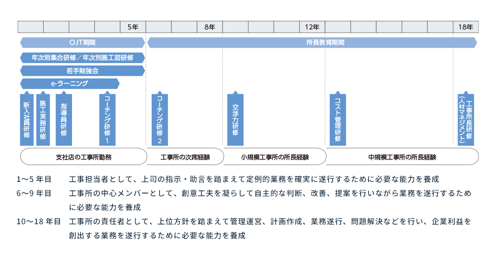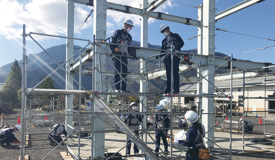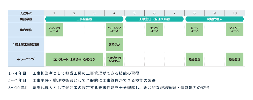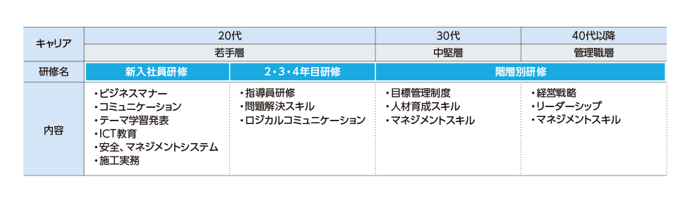 入社時をはじめとして職務遂行能力に応じた階層ごとの研修を実施しています。また、各職種に求められる専門的知識の習得を目的とした職種別研修や安全衛生教育、法務研修なども随時実施しており、座学だけでなく、より実践に近い教育を行うことで仕事への理解を深める工夫も行っています。入社時研修の一環として、建設技能者の育成施設である富士教育訓練センターにおいて技能体験実習を実施しており、測量や仮設材の組み立てなど建設現場における施工実務を自ら行うことで安全、品質、工程管理等の施工管理能力の向上を図ります。また、実習施設内での共同生活を通じて、同期社員同士のつながりを深める機会も設けています。