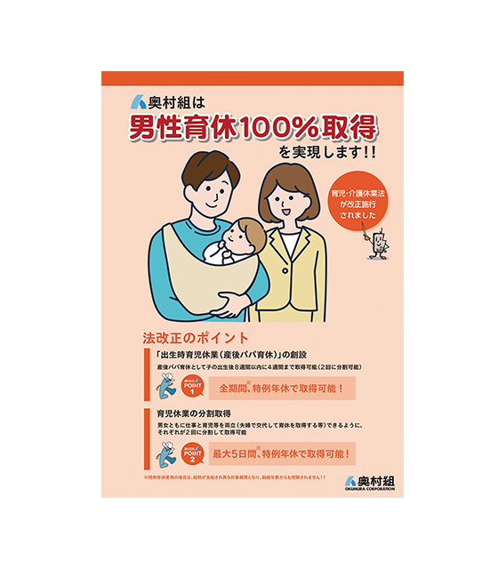 2022年10月1日の「改正育児・介護休業法」の改正を機に、「出生時育児休業(産後パパ育休)」の取得可能期間である4週間(28日)については、失効した年休を充てることができる制度とし、あわせて男性育休推進動画や啓発ポスター、ハンドブックを整備、全社展開することで制度の浸透を図りながら、休みやすい雰囲気を醸成しています。
