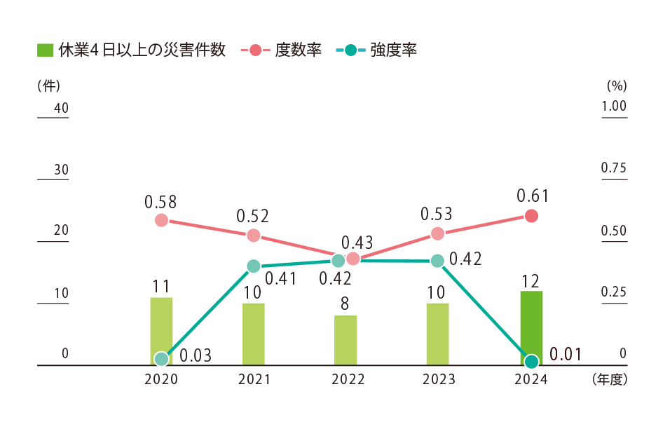 2024年度の安全成績は、死亡災害が0件、休業4日以上の災害が12件発生し、度数率が0.61となりました。安全衛生目標としている「死亡災害ゼロ」は達成したものの、「度数率0.50以下」を達成することはできませんでした。2025年度は、必ず目標を達成するという揺るぎない決意のもと、安全衛生管理計画の各施策に全社一丸となって取り組んでいます。