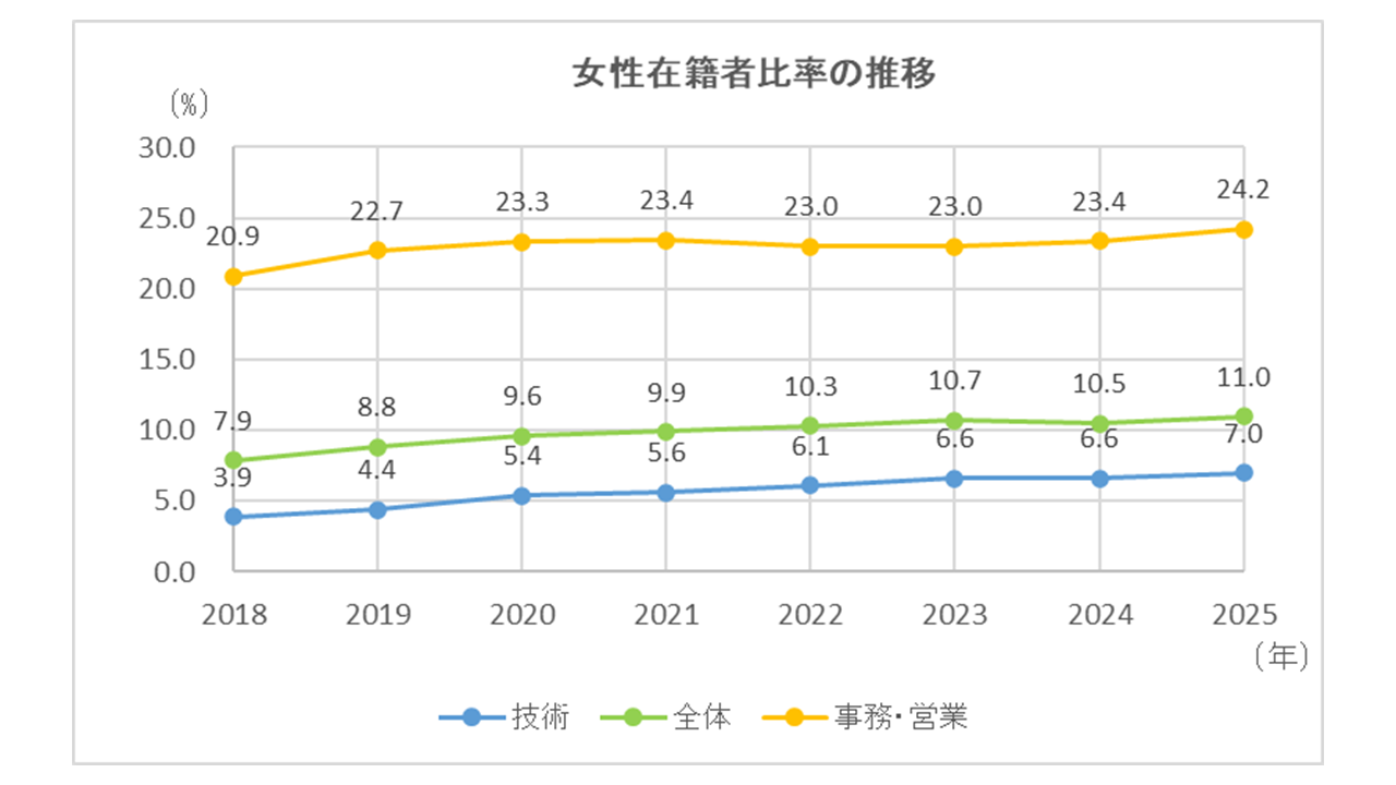 職員における女性の占める割合は、技術職では7.0%、事務・営業職では24.2%、全体で11.0%となっています(2025年4月1日現在)。