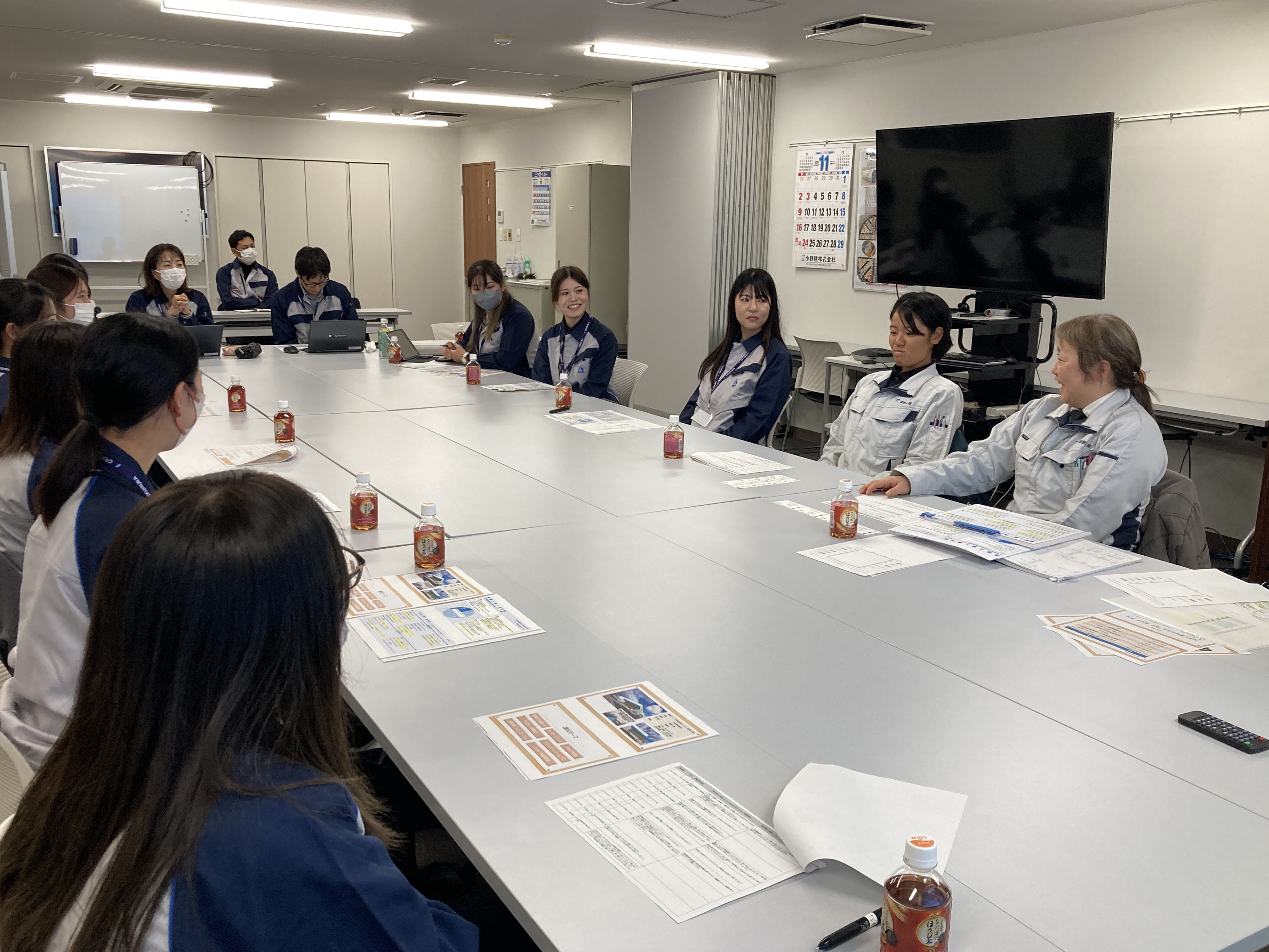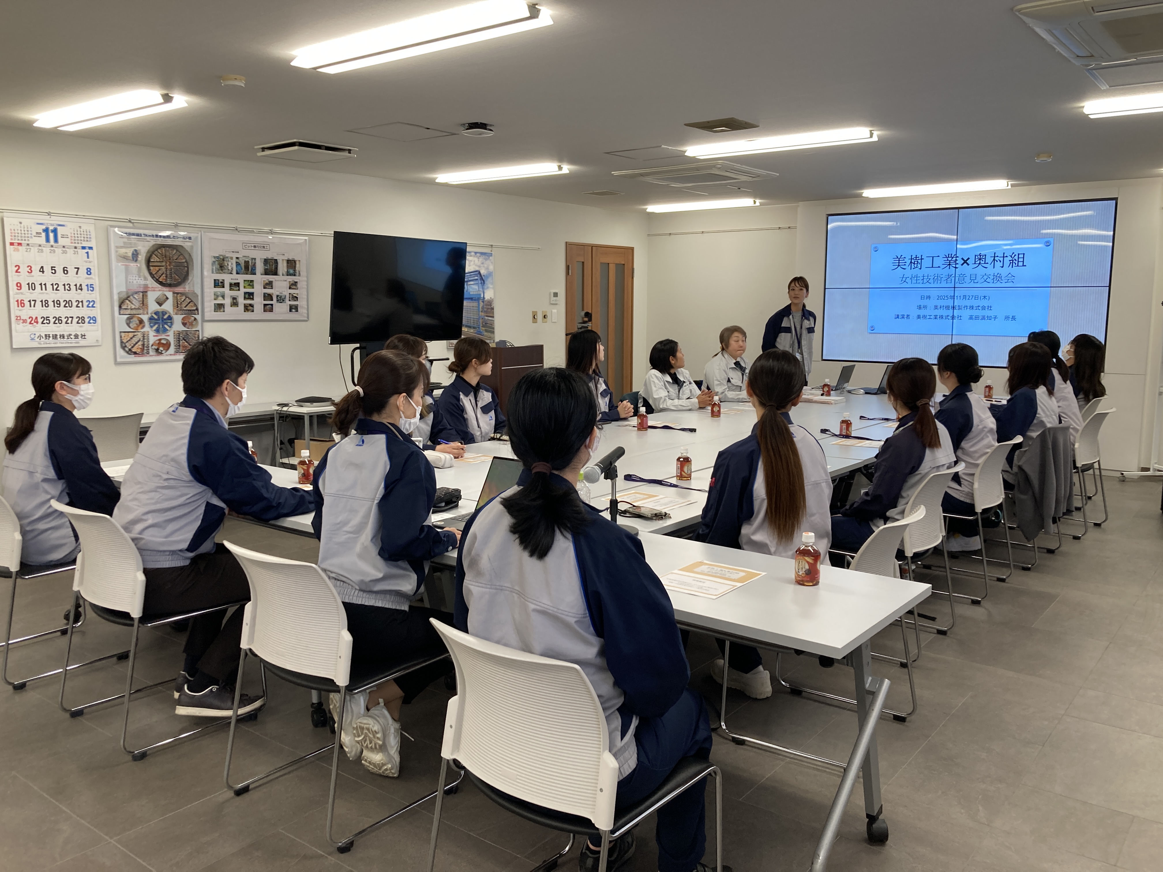 2025年11月27日、美樹工業株式会社の高田所長をお招きし、女性技術者の活躍をテーマとした意見交換会を開催しました。当社からは土木・建築部門に所属する9名の女性技術者が参加し、高田所長からは豊富な現場経験に基づく実践的な視点をご紹介いただき、“現場で力を発揮するために必要な視点”について大変分かりやすくご講話いただきました。参加者からは多くの質問が寄せられ、キャリア形成や働き方など、多岐にわたるテーマで活発な交流が行われました。