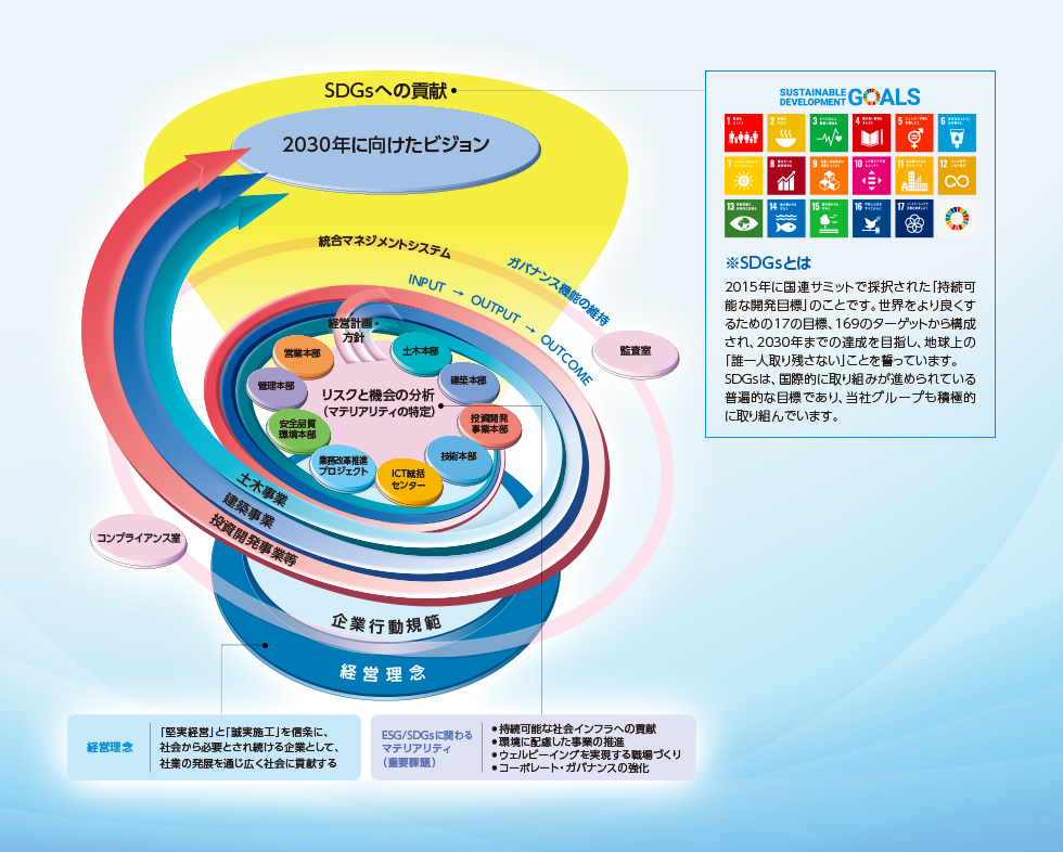 当社グループは、これまでの歴史の中で、『「堅実経営」と「誠実施工」を信条に、社会から必要とされ続ける企業として、社業の発展を通じ広く社会に貢献する』という経営理念をしっかりと受け継いできました。その経営理念を基礎としながら、将来のありたい姿を示す「2030年に向けたビジョン」の実現を目指して、事業活動を推進しています。私たちが描いているビジョンは、SDGsが目指す「持続的な共生社会の実現」と目的を一つにするものと捉えており、事業活動による価値創造がSDGsへの貢献につながるものと考えています。