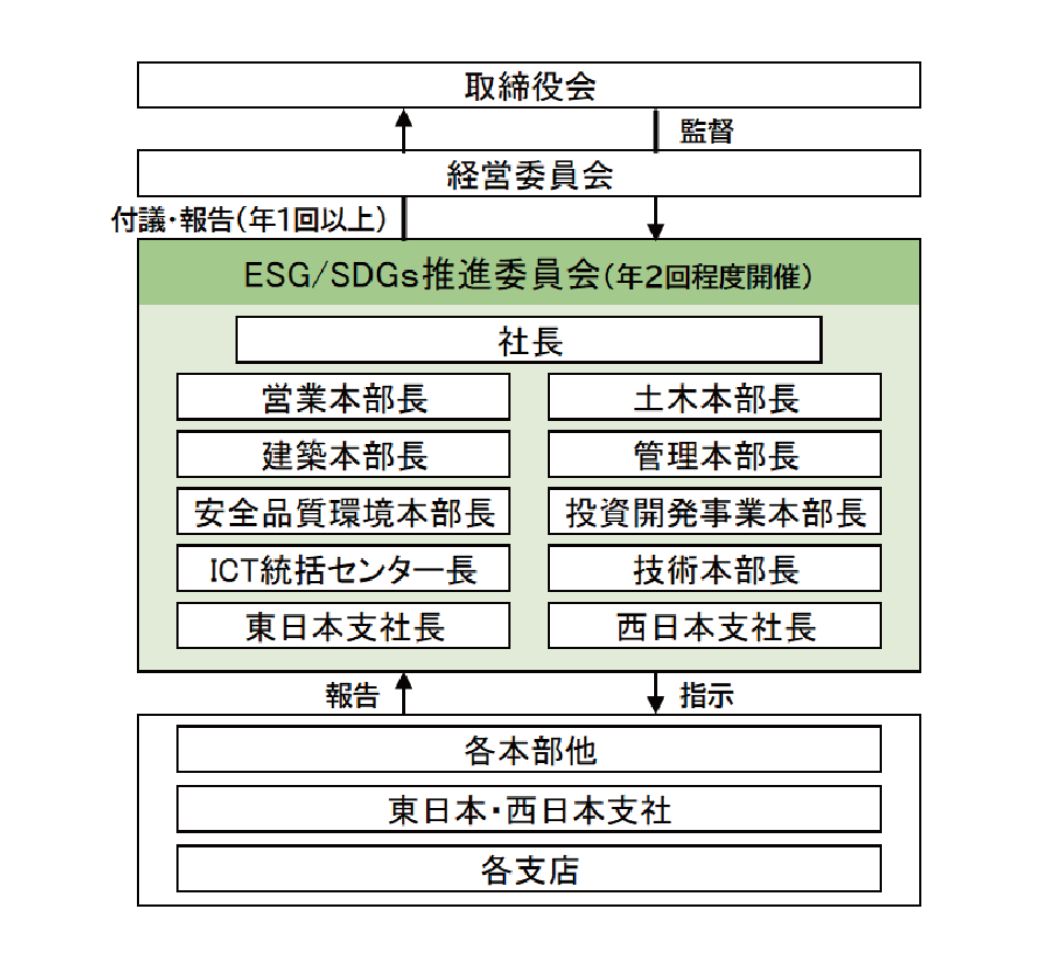 取締役会の監督のもと、気候関連の方針、リスクおよび機会の評価・管理をはじめ、ESG/SDGsに関連する課題等について審議し、戦略的な取り組みを推進する組織として、ESG/SDGs推進委員会を設置しています。