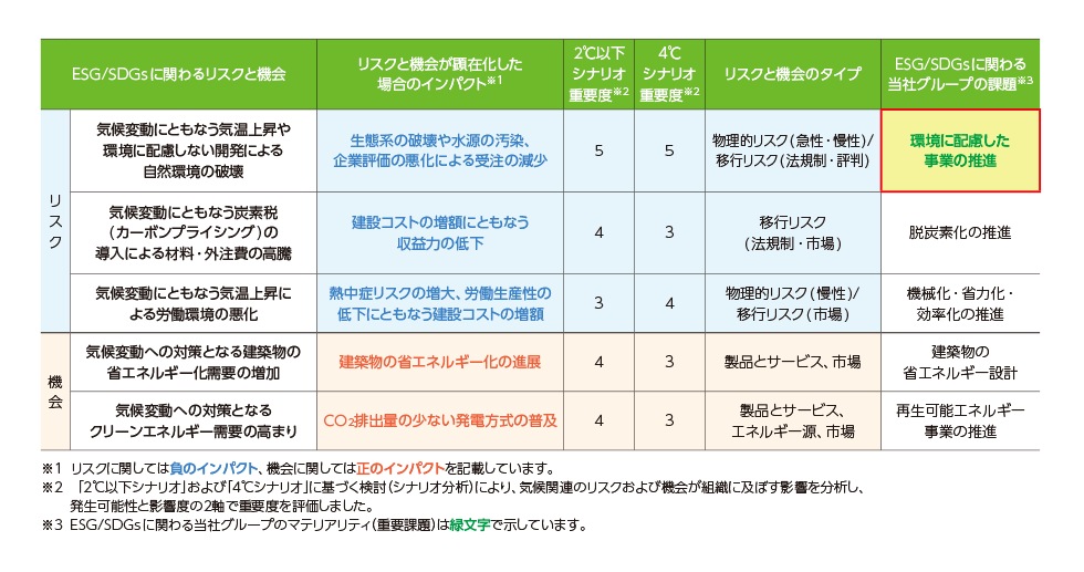 「2℃以下シナリオ」および「4℃シナリオ」に基づく検討(シナリオ分析)による気候関連を含めたリスクおよび機会が組織に及ぼす影響を分析しています。