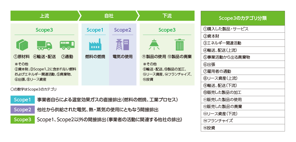サプライチェーン排出量は、GHGプロトコル(国際基準)でScope1,Scope2, Scope3に区分されます。Scope3は、以下の15のカテゴリに分類されます。