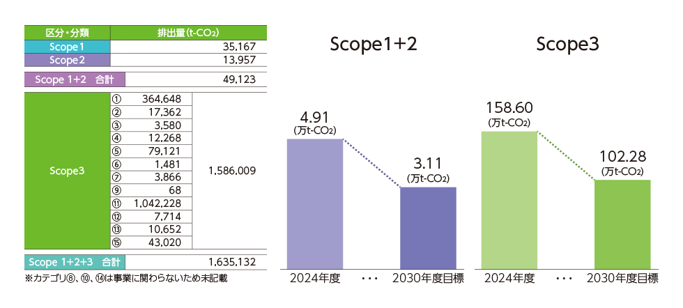 ● 2024年度排出総量実績 Scope1+2:49,123.28t-CO2 Scope3:1,586,008.79t-CO2
