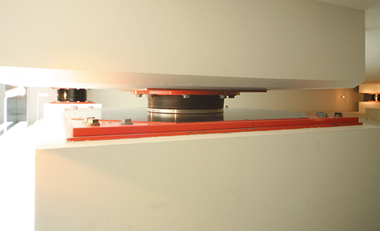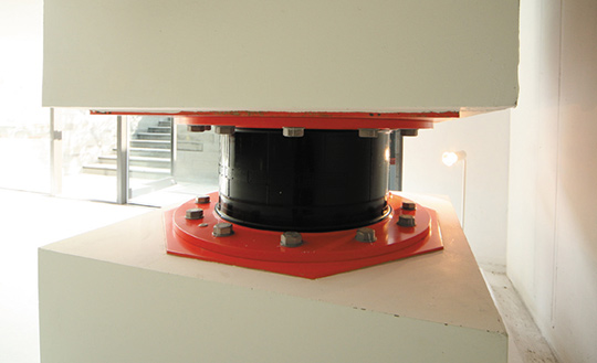 積層ゴム支承と弾性すべり支承を組み合せることにより、長周期免震を実現。比較的軽量な建物にも経済的に対応できます。高減衰積層ゴム支承は、ゴム自体で復元機能と減衰機能を発揮し、ダンパーを不要としています。