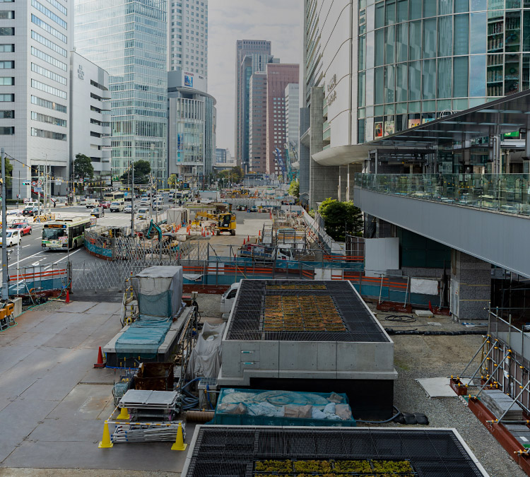 隣接する大阪神ビルディング、新阪急ビルが建替え中であり、ほかにも既設の構造物がひしめき合う。さらに地中には過去の施工図面にも記されない数十年前に埋め込まれた水道管、ガス管などが残存している。“難工事”は端からわかっている。