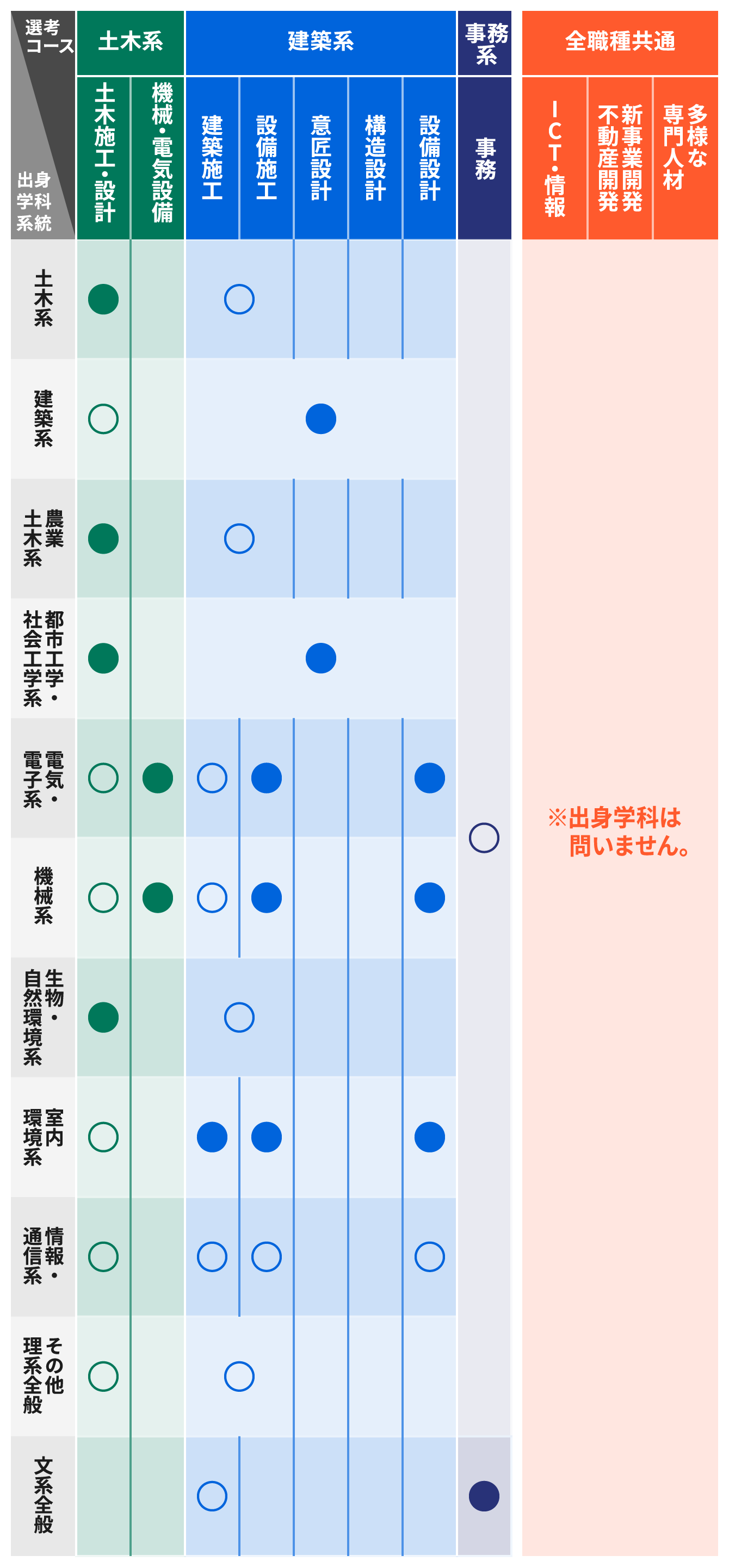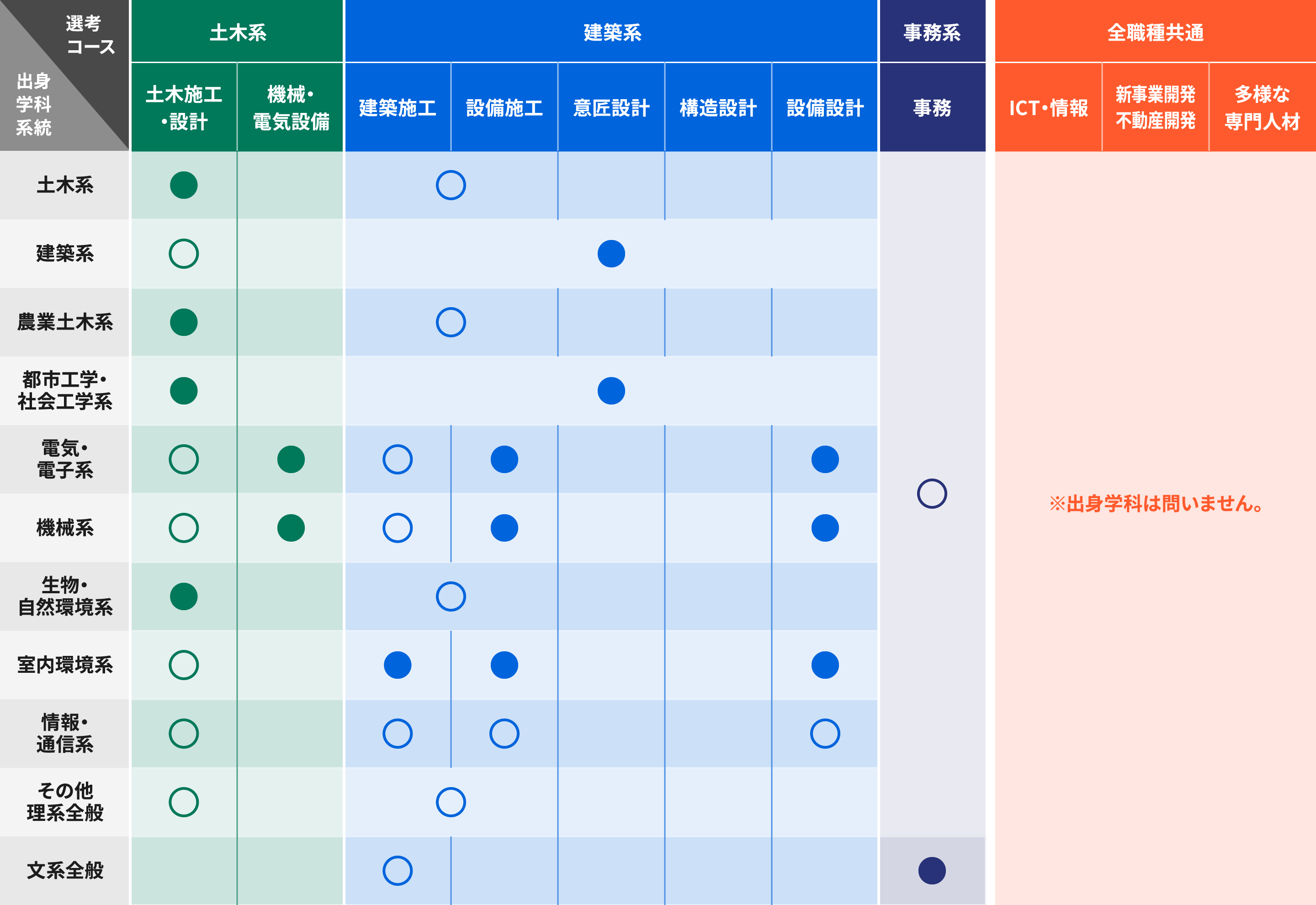 - 凡例 : ●〇 = 応募可能な学科(●は出身者が多い学科)