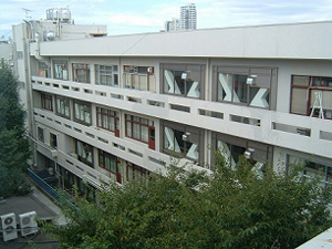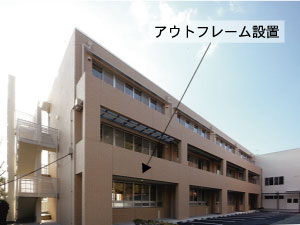 教室外部に2階分の耐震補強アウトフレームを増設しました。また、廊下側の外壁にも外部補強柱を増設しています。