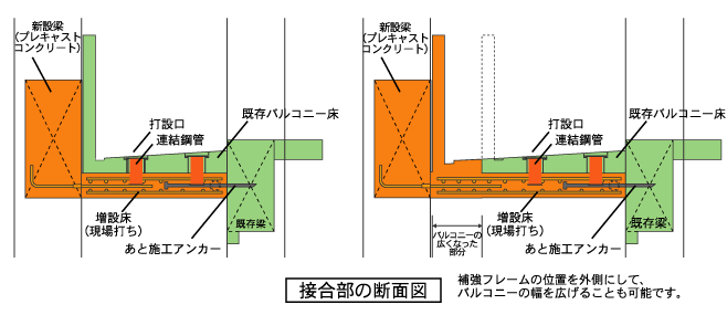 バルコニーのあるタイプの建物を外側から耐震補強する場合に適した工法です。当社の独自工法として、既存建物との接合に特殊な連結用鋼管を用い、あと施工アンカーの数量を減らすことにより騒音・振動・粉塵の発生を抑えます。