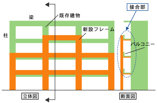 鉄筋コンクリート造または鉄骨鉄筋コンクリート造の既存建物を対象とした外付けフレームによる耐震補強工法です。既存建物の外側からH形鋼を使用した門形フレームを柱・梁外面に取付けて補強します。