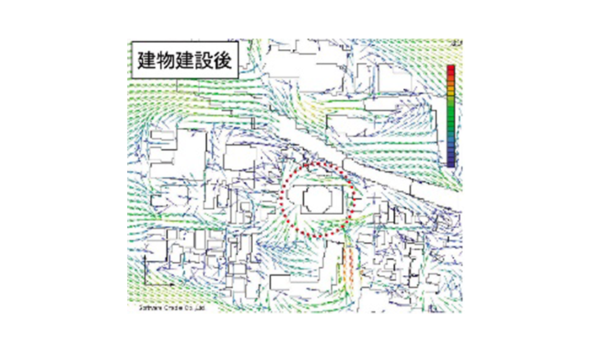 ビル建設による周辺市街地の風への影響を、3次元の気流解析と統計的手法により予測評価できます。