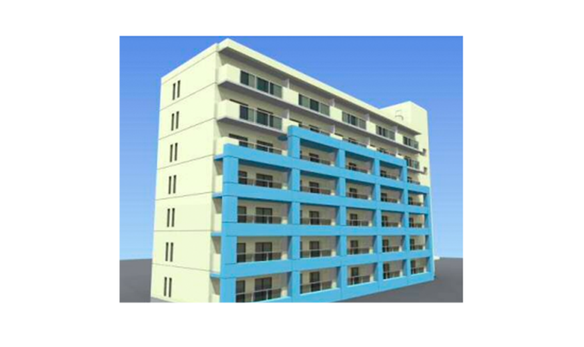 バルコニーや廊下の建物の外側にプレキャストコンクリートのフレームを増設し、既存の柱・梁と一体化することで耐震補強する工法です。バルコニーや廊下など跳ね出し床があって柱・梁を直接補強することが難しい場合でも、建物を使いながら耐震補強できます。