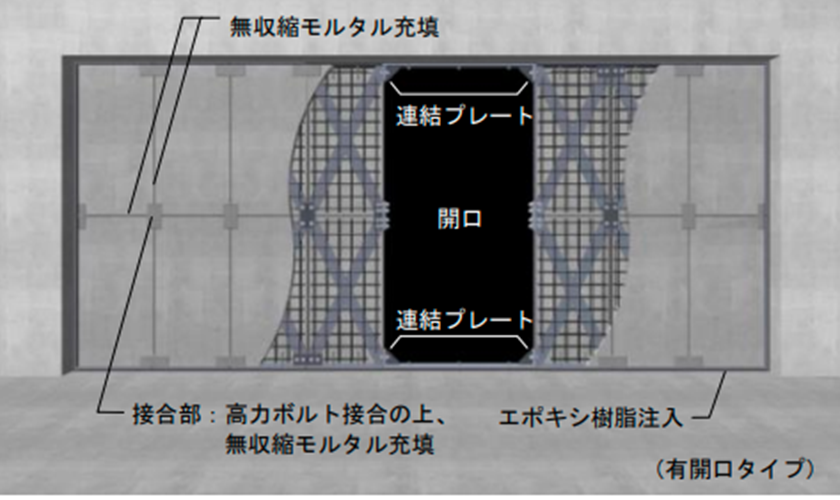 設備改修等により既存の鉄筋コンクリート梁に新たに設ける貫通開孔部の補強工法です。開孔の周囲に鋼板をアンカーボルトとエポキシ樹脂で固定することで補強するため、施工の合理化を図ることができます。