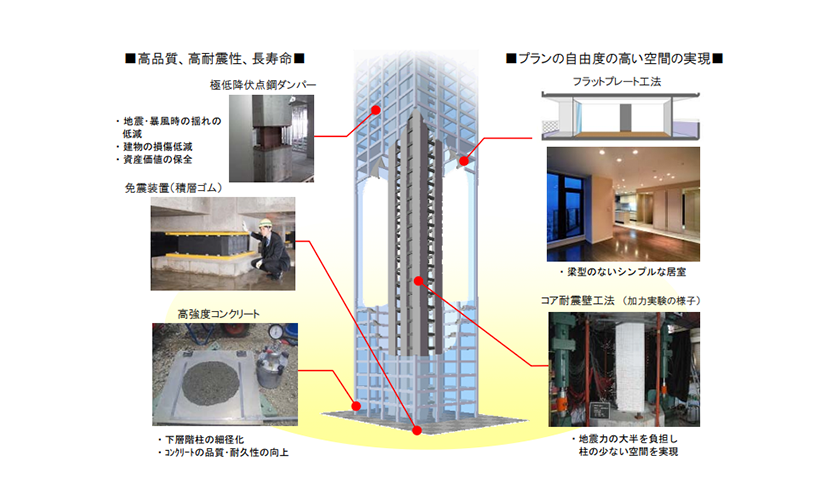 超高層建物の実現に資する様々な技術を開発しています。また、免震・制震技術による地震安全性の向上、意匠・設備の設計・施工技術を含めた総合技術として、魅力的な超高層建物の実現に取り組んでいます。