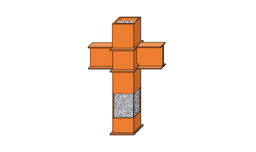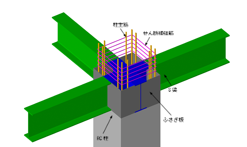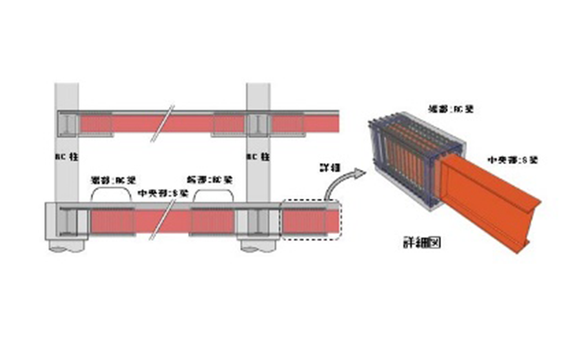 柱を鉄筋コンクリート造、梁を鉄骨造とするハイブリット構造の内、鉄骨梁の端部を鉄筋コンクリート部材に埋め込んだ合成梁として柱に結合する構法です。柱梁接合部の納まりを合理化でき、効率的な施工や鉄骨数量の削減が実現できます。