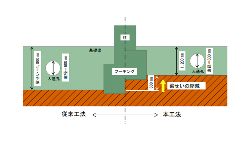 基礎梁に人通孔などを設ける際に、従来はその3倍以上の梁せいが必要でしたが、貫通孔周囲の補強方法を工夫することにより、梁せいを2倍に抑えることができる工法です。これによって躯体数量や掘削土量を削減することができます。