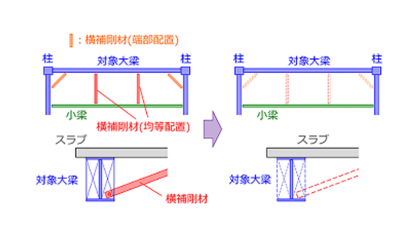 床スラブによる拘束効果を考慮することで、従来必要とされていた鉄骨梁の横補剛材を省略する工法です。より合理的な設計・施工が可能となり、環境負荷低減にも貢献できます。