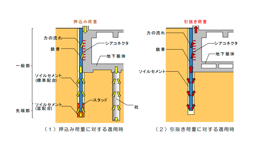 仮設の山留壁として用いられているソイルセメント壁の性能を向上させ、建物を支持する本設の構造体として利用する工法です。押込み荷重に加えて引抜き荷重に対しても働くため、建物外周部の杭を削減できます。