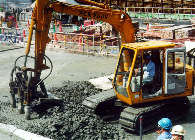建設現場で容易に入手することができる掘削土砂や河床堆積物などの岩石質な原材料にセメントと水を添加し、簡易混合した後、ダムの仮締め切り工事、本体工事、擁壁などの埋め戻し工事に適用します。