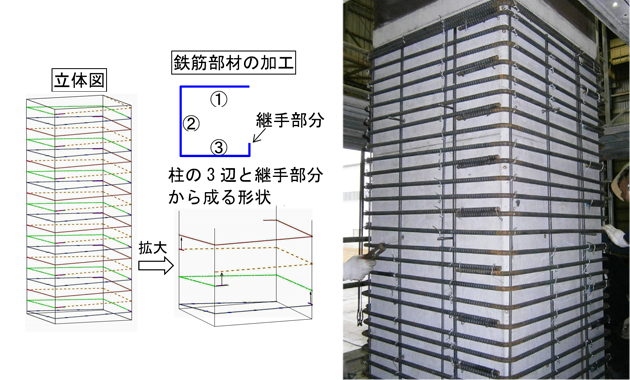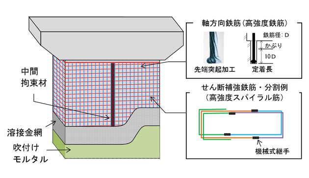 既設鉄筋コンクリート柱の耐震補強工法です。柱の3辺(コの字)と継手部分からなる形状に加工した普通鉄筋を既設柱の外周に一段ずつらせん(スパイラル)状に組み上げ、その上にモルタルを吹き付け仕上げることで、せん断耐力、変形性能を大幅に向上させます。