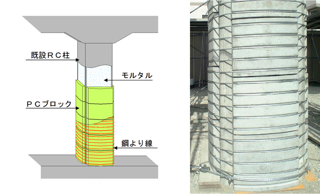 (プレキャストコンクリートブロックをスパイラル鋼線で巻き立てたRC柱耐震補強工法)