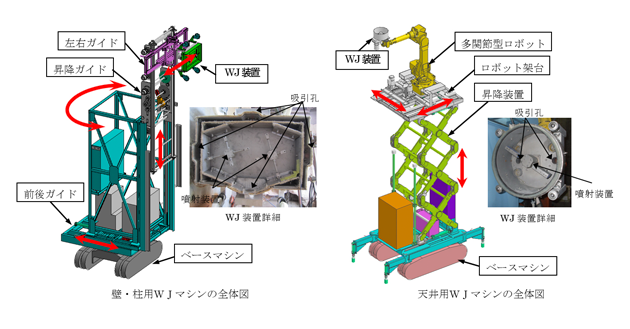 コンクリート構造物の補修・補強を行うにあたり、コンクリート表面の脆弱部の研掃や塗膜の除去をウォータージェット装置を用いて行う工法です。ウォータージェット装置は一定の噴射距離および速度で自動的に移動するため、作業効率の向上、表面処理の均一化が図れます。