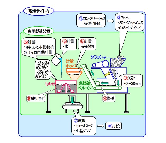 現場で簡単に製造する再生コンクリートで、コンクリート廃材を現場内で破砕しそのまま骨材として利用します。JIS規格外のコンクリートとして使用でき、専用製造装置はコンパクトで10tトラックに積載することができます。