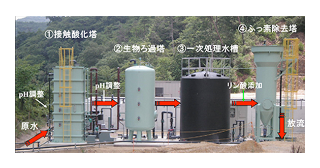 鉄バクテリアの作用を利用して水中の鉄分等を酸化して析出させ除去する「生物接触ろ過法」と微細な種晶の周りに水中のフッ素やカルシウムなどの除去対象物質を結晶化させて除去する「晶析法」とを組み合わせた、重金属等を含有する汚染水を効率的に浄化するシステムです。