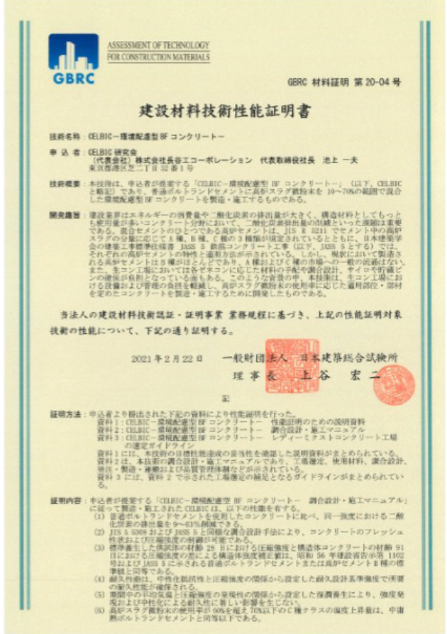 CELBIC研究会(長谷工コーポレーション(幹事)、青木あすなろ建設、淺沼組、安藤ハザマ、奥村組、熊谷組、鴻池組、五洋建設、錢高組、鉄建建設、東急建設、東洋建設、矢作建設工業の13社で構成)は、普通ポルトランドセメントに対して10~70%の範囲で高炉スラグ微粉末を使用したコンクリートとする「CELBIC-環境配慮型BFコンクリート-」について、一般財団法人 日本建築総合試験所より2021年2月22日付けで、建設材料技術性能証明(GBRC 材料証明 第20-04号)を再取得しました。