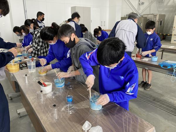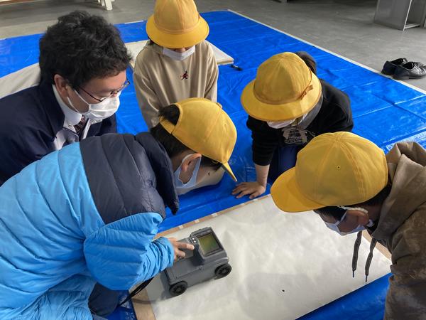 続いて、材料実験棟でコンクリートについて学んでもらいました。コンクリートの材料や性質をわかりやすく説明した後、練ったばかりのコンクリートで容器作りに挑戦してもらいました。また、電磁波レーダーを用いた非破壊検査も体験してもらいました。