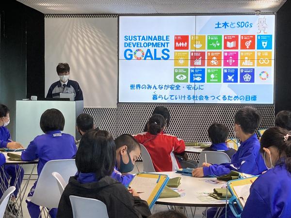この見学会は、「土木の日(11月18日)」の関連行事として毎年この時期に土木学会関東支部との共催で実施しており、地元の小学生との交流を続けています。今年は昨年同様"土木とSDGs"をテーマに、身近に存在する土木や新しく整備されたビオトープの紹介、コンクリートを用いたものづくり体験などを通し、土木の面白さを体感してもらいました。