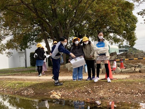 最後に、新しく整備されたビオトープで、つくば市および近隣に生息する希少な生物を観察してもらいました。身近に希少な生物が生息していることを知ってもらうとともに、生物多様性の保全の重要性について説明しました。