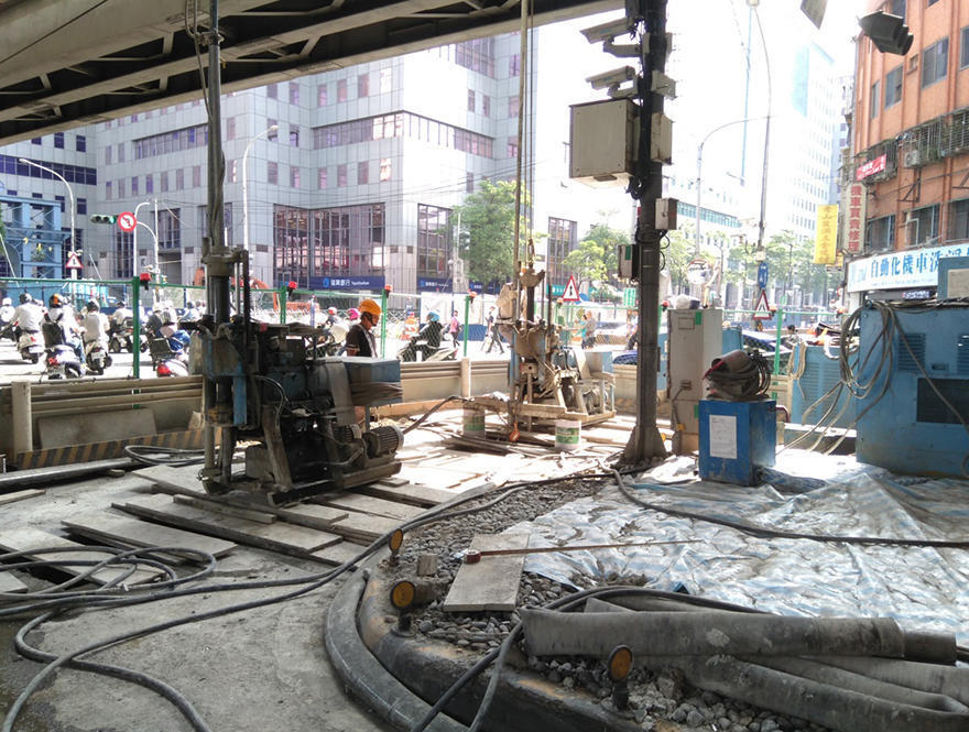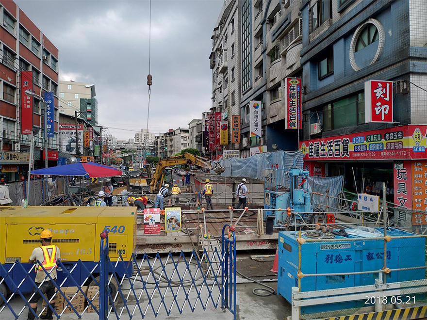 由於本工程主要位於新北市中和區連城路及金城路上,路幅狹窄而車流量大,因此需配合皇昌營造股份有限公司站體交維時程分段進場施做地盤改良及建物保護工程,自106年2月起至109年9月期間,陸續完成本工程所有潛盾段之地盤改良及建物保護工程。