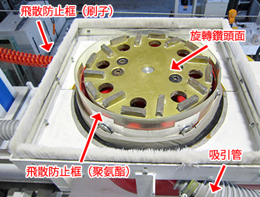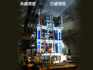 照片-3 研掃裝置的施工狀況作為在使用過程中對隧道天花板進行修復及加固工程之前工程,是對混凝土表面的污垢和舊塗膜等進行切削的表面處理(基底處理作業)之設備。在控制壓力的同時,將嵌入研掃裝置的研磨機高速旋轉鑽頭按壓在天花板上,以一定速度自動運轉進行表面處理。研磨機配備兩層飛散防止框和吸引裝置,防止粉塵等飛散。與人工作業相比,應用該裝置可實現省力化、提高安全性、提高品質及均一化。