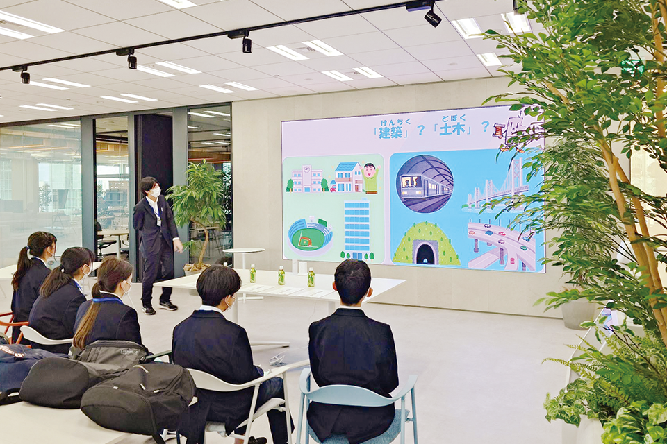学生の進路学習の一環として、クロスイノベーションセンターにおいてオフィス見学を受け入れています。総合インフラストラクチャ―企業として、建設事業やさまざまな新規事業、ならびにそれらに関する研究開発など、奥村組の取り組みを紹介することで、若い世代に建設業の魅力を発信しています。クロスイノベーションセンターへの訪問をきっかけに、建設業の未来を担う人が増えることを期待しています。